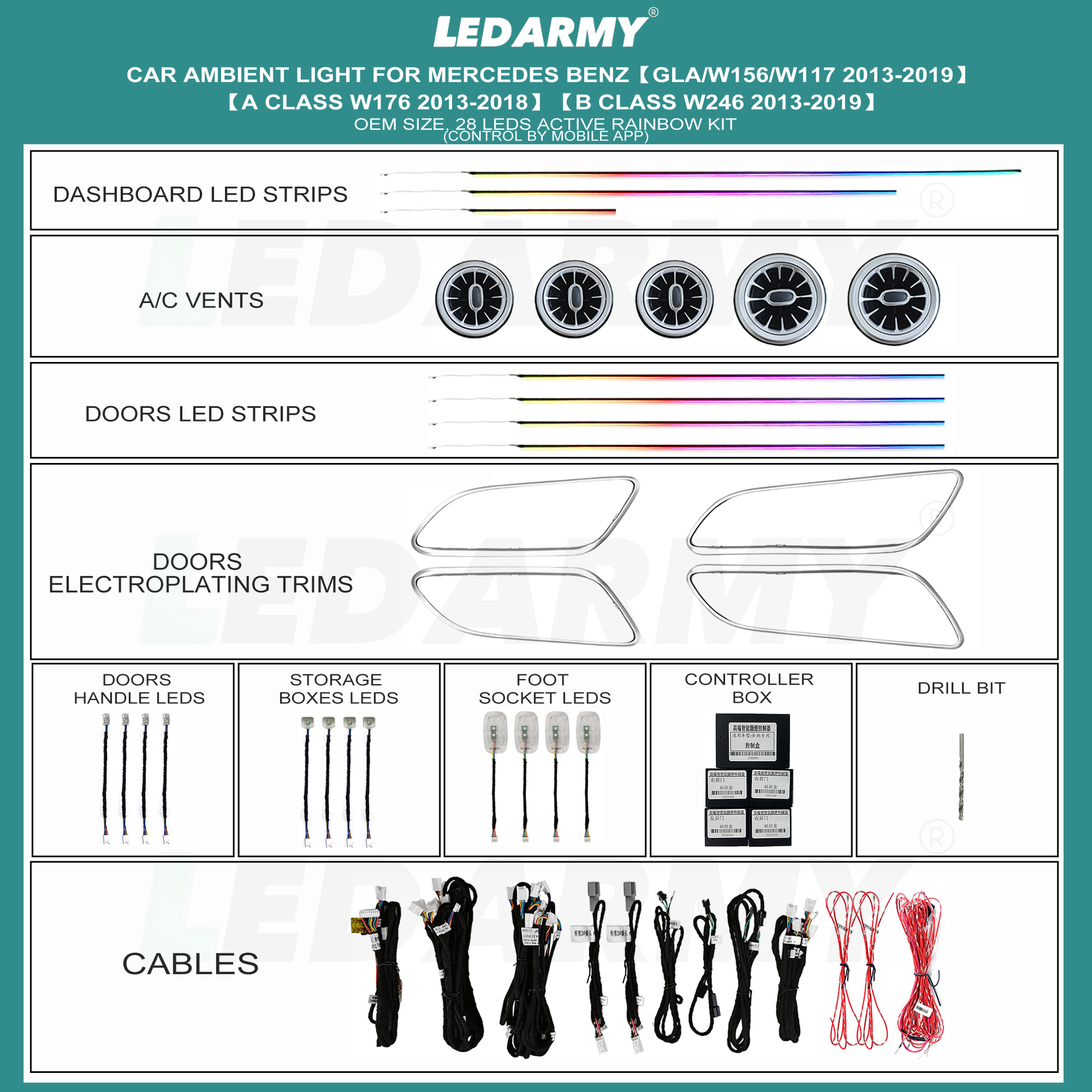 LED Ambientebeleuchtung Innenraum Set für Mercedes A-Klasse W176 / CLA C117 / GLA X156 / B-Klasse W246 RGB Lüftungsdüsen & Interieur Licht Kit App-Steuerung